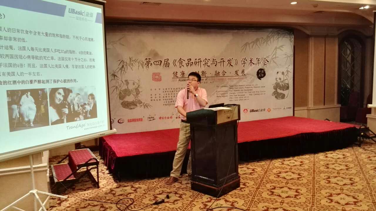 2015年9月16日-18日由天津市食品工業(yè)生產(chǎn)力促進(jìn)中心主辦,《食品研究與開發(fā)》編輯部承辦,成都市食品藥品檢驗(yàn)研究院協(xié)辦的第四屆《食品研究與開發(fā)》學(xué)術(shù)年會(huì)與成都召開。益倍建公司總經(jīng)理李赫宇受邀參加并做“關(guān)于白藜蘆醇抗衰老系列健康食品的研究與開發(fā)”的主題報(bào)告。
